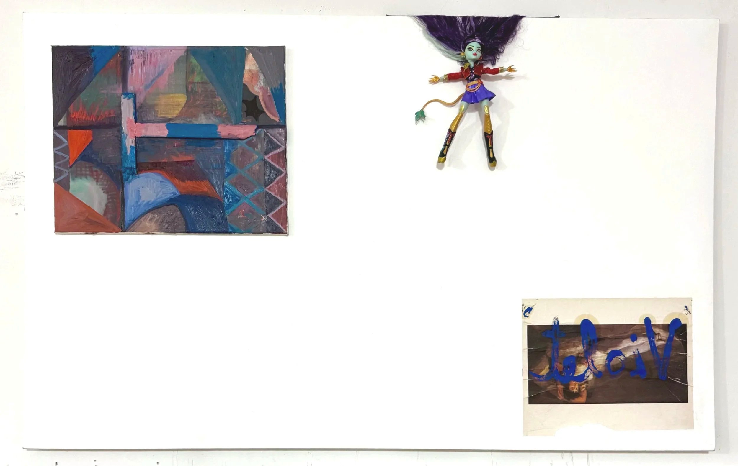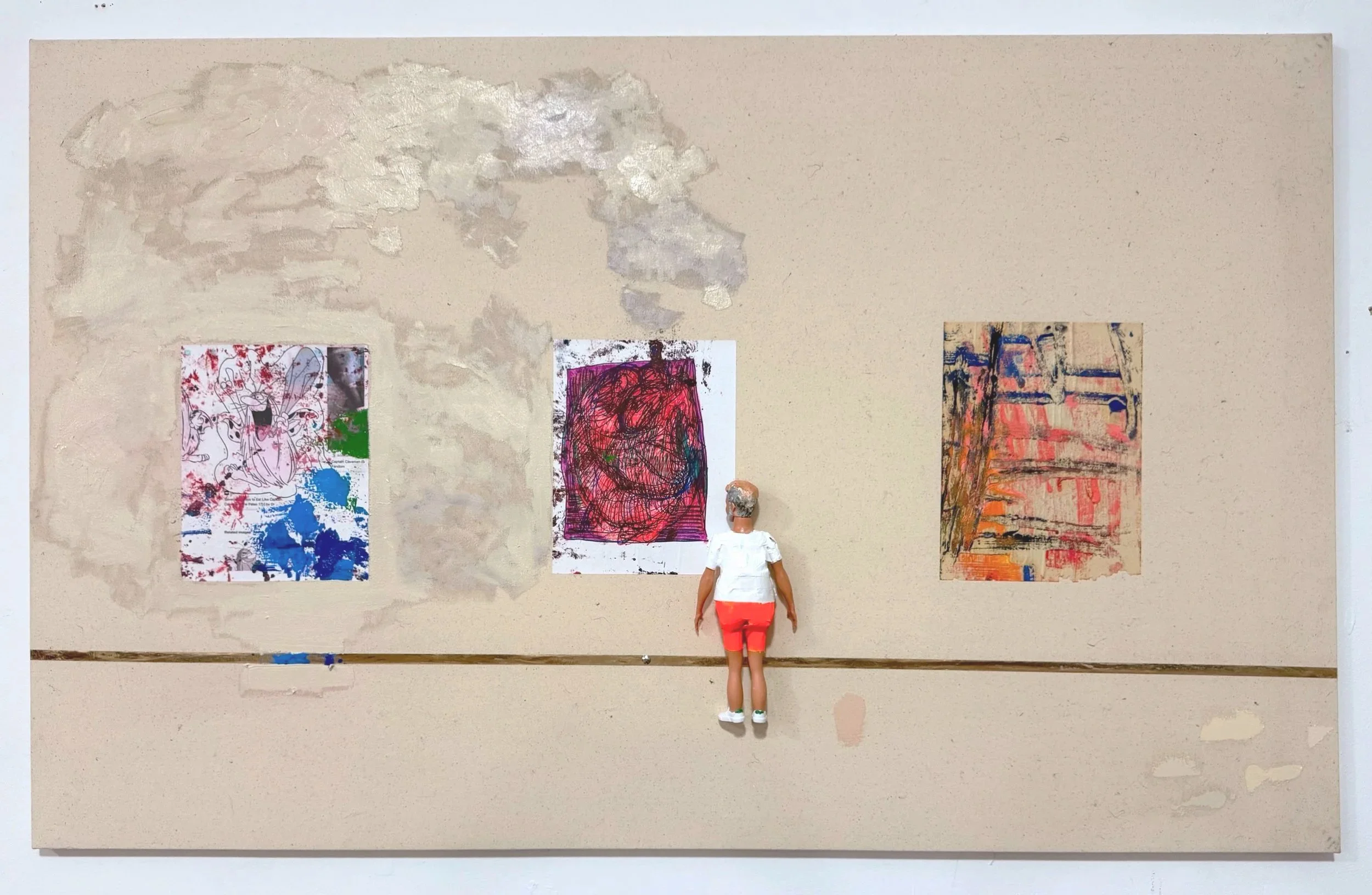 "Isolation" 37.5"x60" tape, doll, drawing on paper, oil on canvas 2025